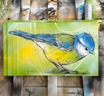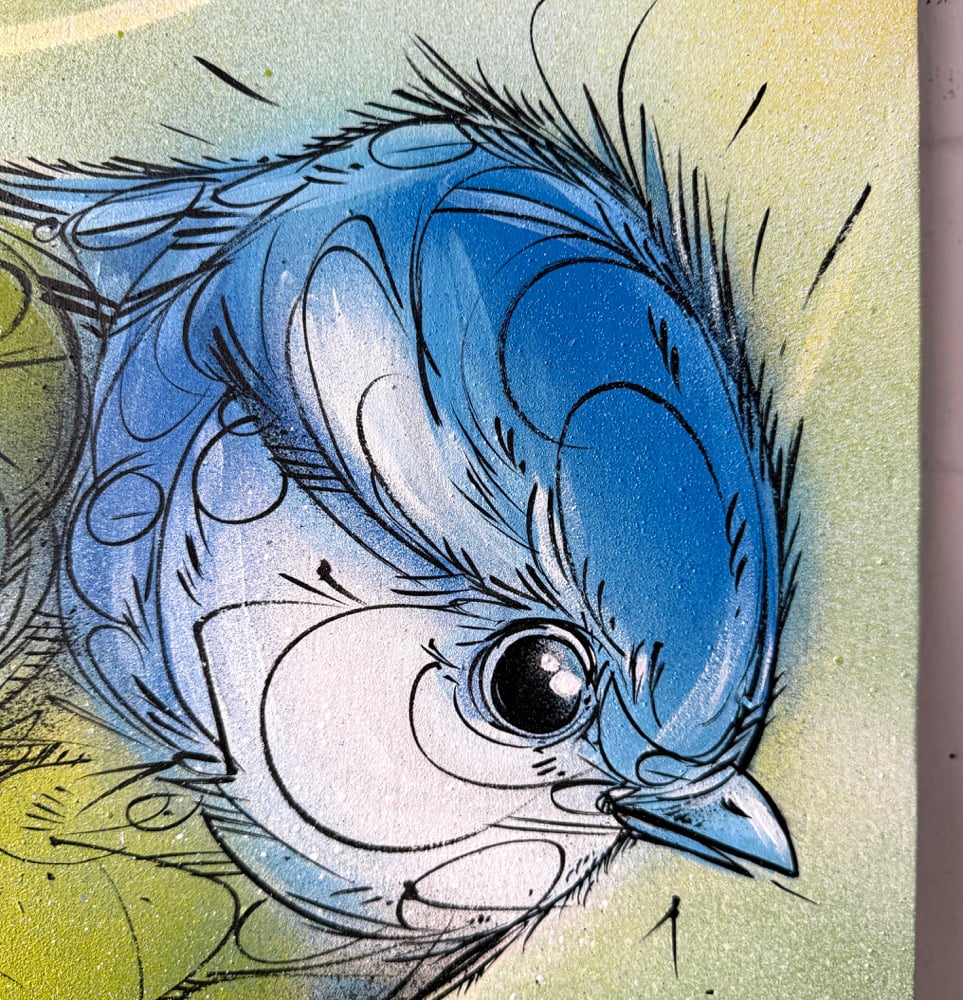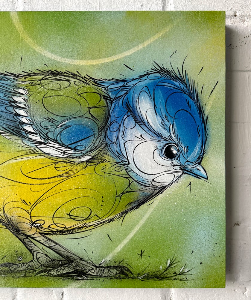 An original artwork depicting a blue tit, built up through layered spray paint, ink and expressive linework. The piece combines soft colour transitions with energetic details, balancing a light and playful presence with a sharp, lively character.