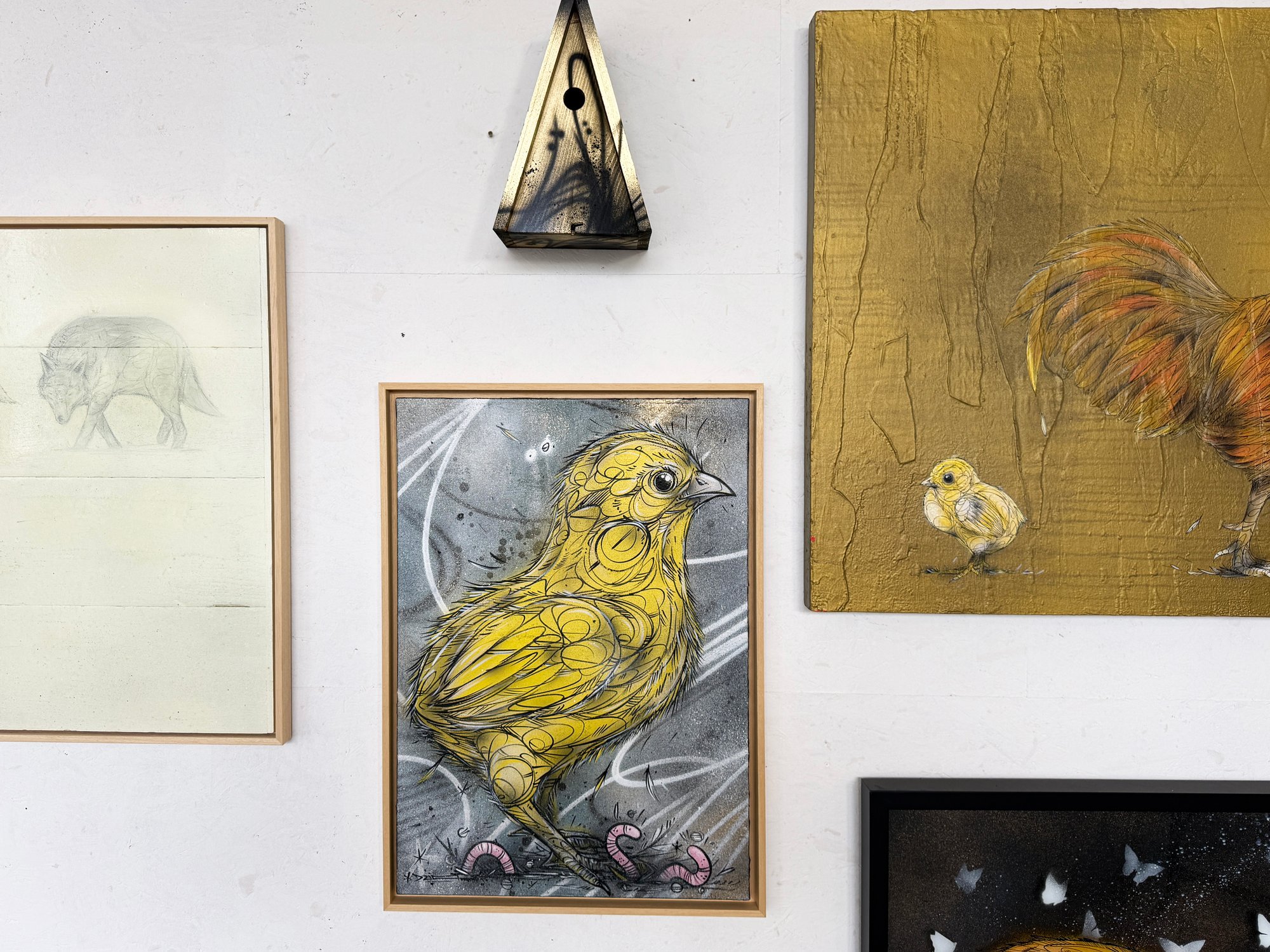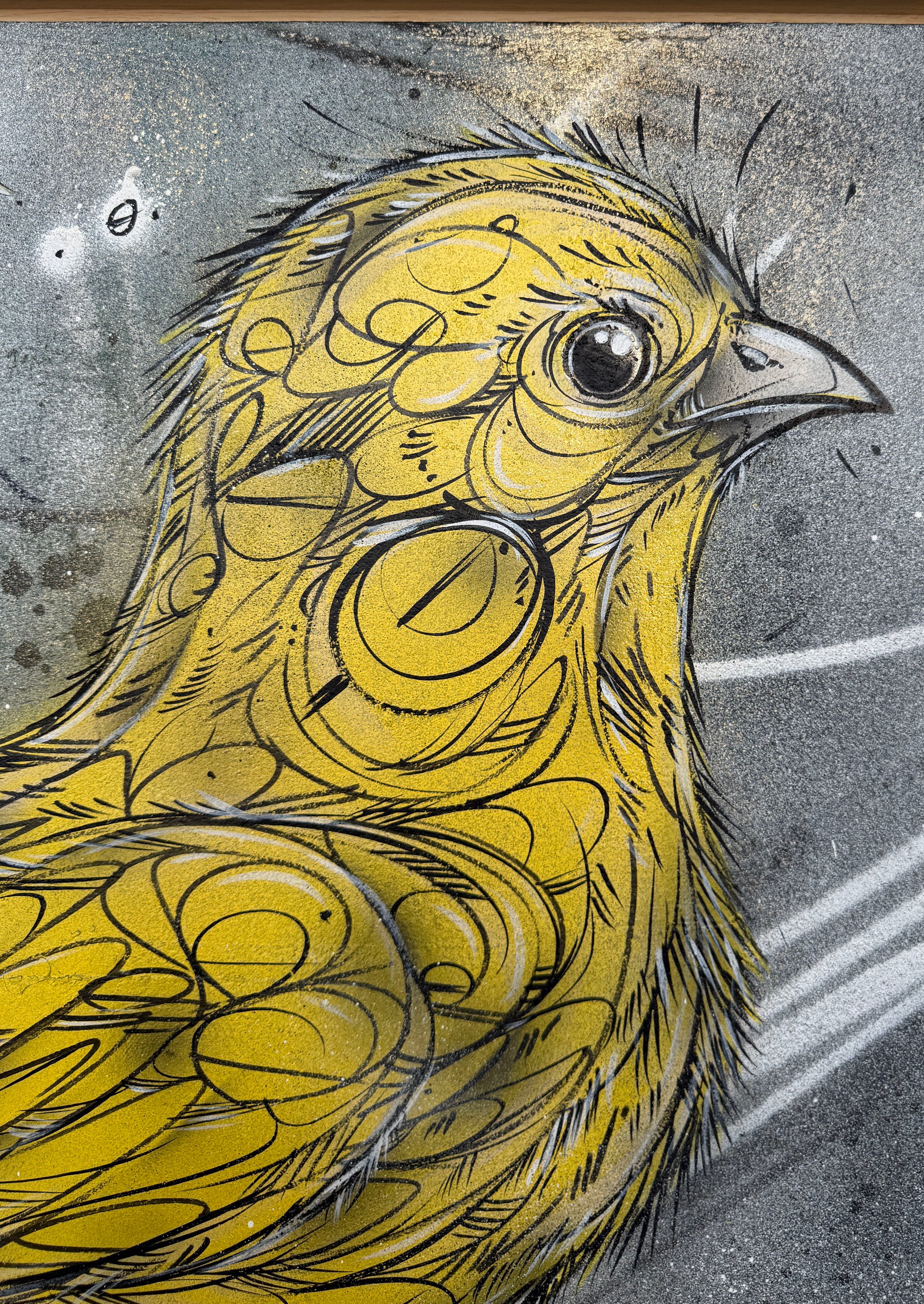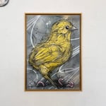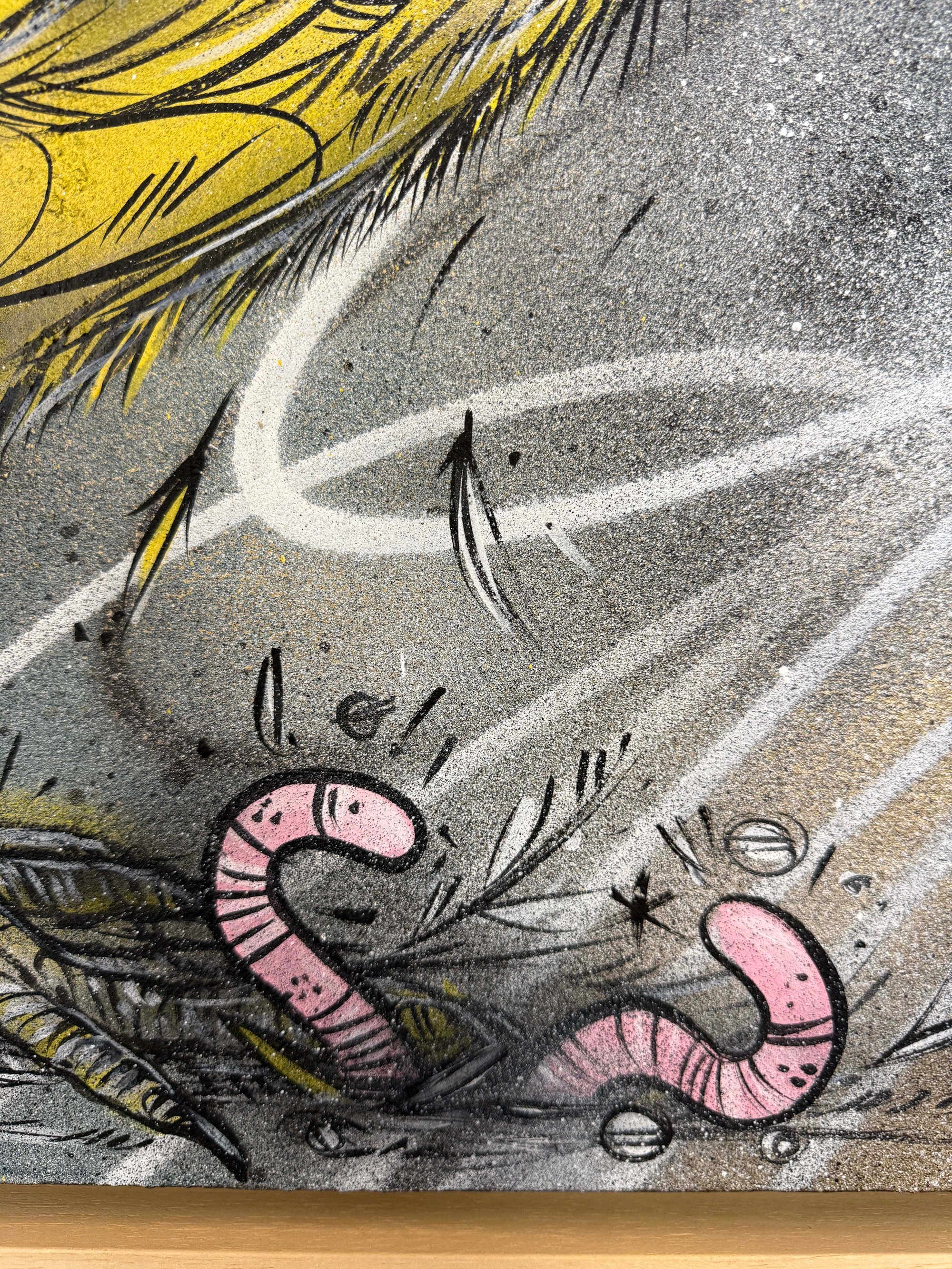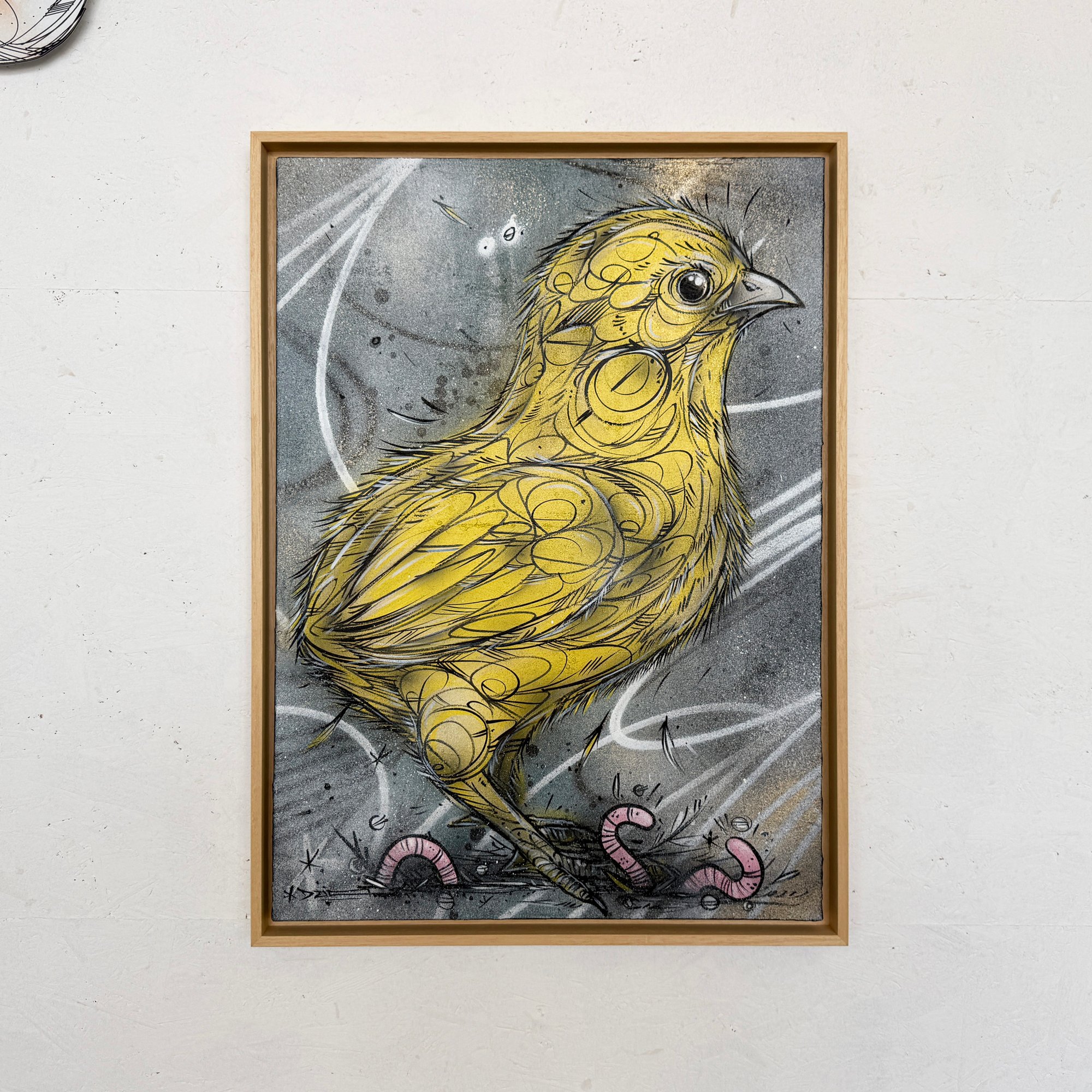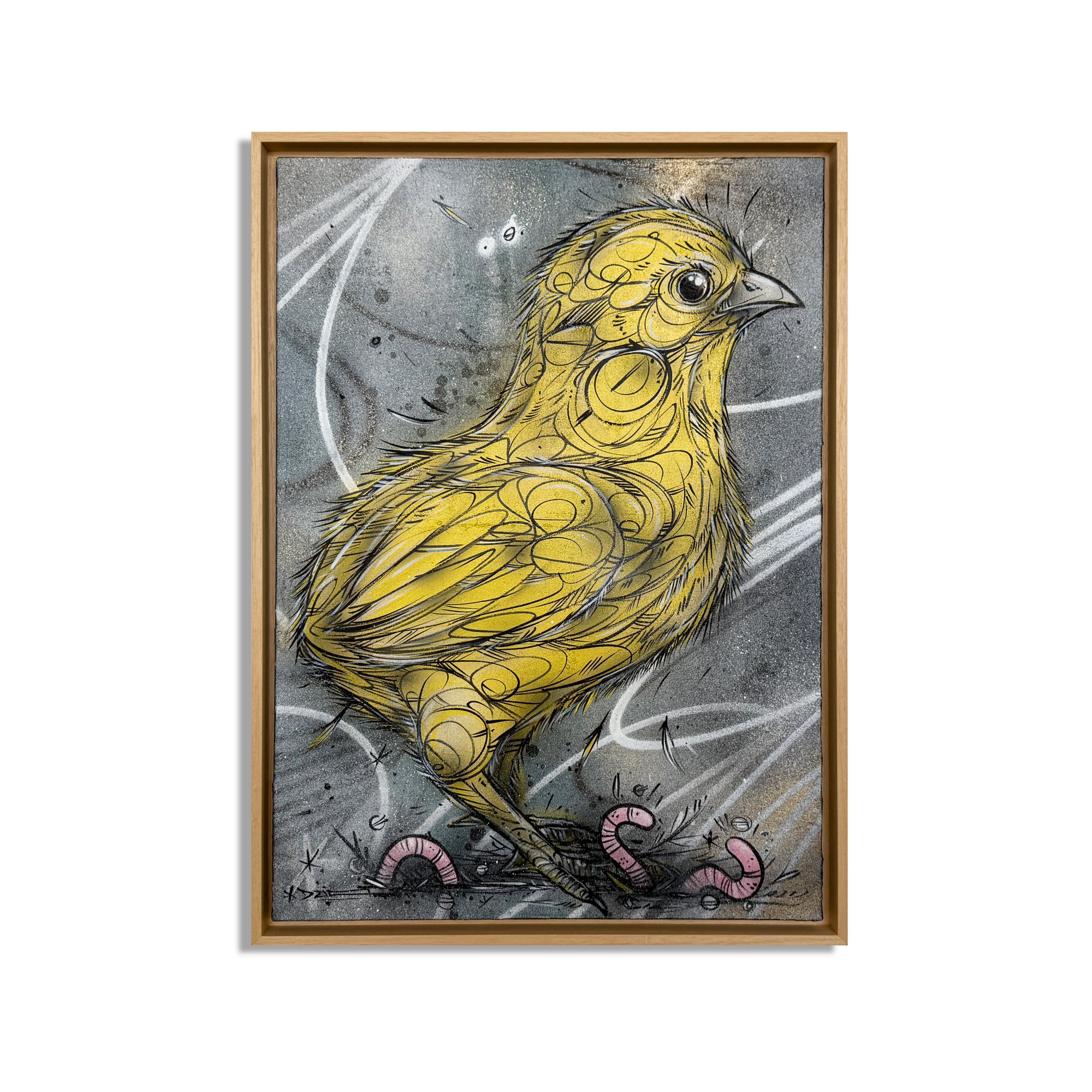 First Steps is an original mixed media work on canvas, capturing the fragile confidence and curious energy of a young chick stepping into the world. Small in scale but full of presence, the piece balances softness and tension through layered linework, sprayed textures, and raw surface detail.