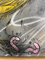 The bright yellow figure stands out sharply against a muted grey background, giving the work both warmth and contrast. Fine black lines, loose gestures, and subtle shifts in tone keep the image lively and immediate, while the pink worms add an unexpected playful edge. The result is a piece that feels tender, alert, and slightly rebellious all at once.